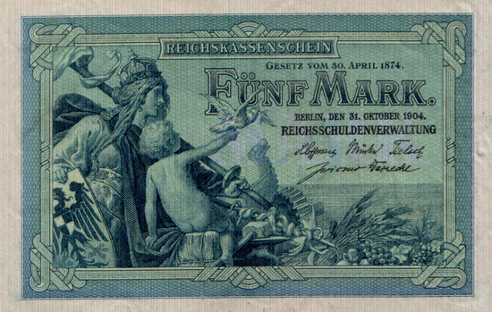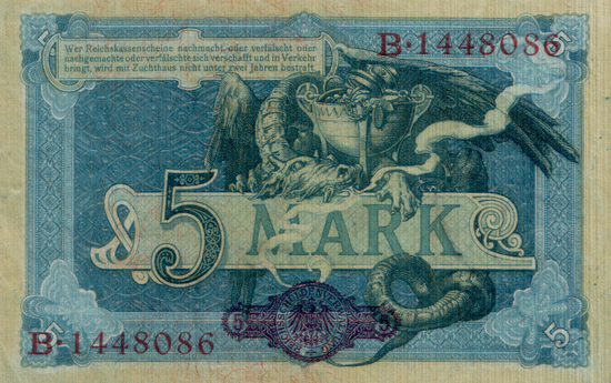 1875 wurde die Deutsche Reichsbank gegründet, die den Geldumlauf im gesamten Reich zu regeln hatte und dazu das Recht besaß, nach Bedürfnis Banknoten herauszugeben. Anfänglich wurde ihr nur gestattet, Banknoten mit den Werten zu 100, 200, 500 und 1000 Mark, bzw. einem Vielfachen davon, auszugeben. Für die benötigten niedrigeren Werte wurde der Reichskanzler ermächtigt, 5, 20 und 50 Mark-Scheine, später auch 10 Mark-Scheine, ausgeben zu lassen. Der Gesamtbetrag durfte 120 Million Mark nicht überschreiten, die Scheine wurden in den einzelnen Bundesstaaten nach dem Maßstab der Bevölkerungszahlen verteilt. Die Ausfertigung dieser sogenannten Reichskassenscheine wurde der Preußischen Haupt-Verwaltung der Staatsschulden unter der Bezeichnung Reichsschulden-Verwaltung übertragen. Die Inflation entwertete die Reichskassenscheine in hohem Maße. Auch unser 5 Mark-Reichskassenschein war 1923, obwohl noch gültig, praktisch wertlos. Die Weimarer Republik verzichtete darauf, weiteres Staatspapiergeld herauszugeben.